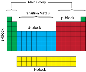 The periodic table can be divided up into several blocks based on their highest energy electron orbital type.