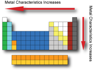 Metal Characteristics Metals are usually shiny, malleable, hard and are good conductors of electricity and heat. Metals have low ionization energy and low electronegativity which allows them to conduct electricity as electrons can flow through them easily. Metal characteristics tend to increase when moving from the top-right to bottom-left of the periodic table. The most nonmetallic elements(oxygen, fluorine, chlorine) occur at the top right of the Periodic Table.