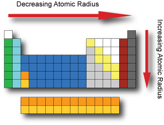 When elements are arranged in order of increasing atomic number, there is a periodic repetition of their physical and chemical properties. Some of these properties include atomic radius, electronegativity, ionization energy and metallic characteristics. Factors affecting these properties include the number of protons in the nucleus, the distance from the nucleus and amount of shielding inner electrons provide to the valence electrons. Atomic radius The atomic radius is a somewhat imprecise measure that can refer to the mean distance from the center of the nucleus to the boundary of the surrounding electron cloud. We can determine the radius by dividing the distance between two bonded atoms in half. Depending upon the type of bond we can obtain very different values. If the bond is covalent it is called a covalent radius. If the bond is ionic it is called an ionic radius. The Atomic radius tend to decrease when moving across a period from left to right. As we move across a period electrons are added to the same energy level and protons are added to the nucleus; increasing the effective nuclear charge and pulling the electrons closer to the nucleus. The Atomic radius tend to increase when moving down a group from top to bottom. As we go down a group additional energy levels are added; and each subsequent energy level is further from the nucleus.