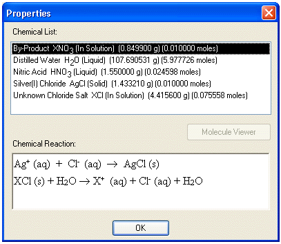 The Chemical Properties dialog box shows the current chemicals and their states in a piece of lab equipment. Where applicable, the molecular structure of a chemical may be studied by selecting it and clicking on the Molecular Viewer button.