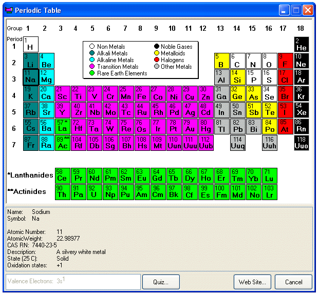 The Model Periodic Table is an interactive periodic table application with a quiz feature. More information is available from the Model Periodic Table Help